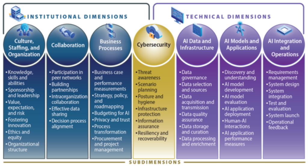 Although developed within the transportation domain, the CMM was designed to be applicable across federal missions, addressing common challenges related to governance, cybersecurity, data and infrastructure, workforce readiness, AI models, and system integration. The model enables agencies to assess current maturity, identify gaps, and understand how to progress toward more advanced AI use in a structured and cost-effective way.